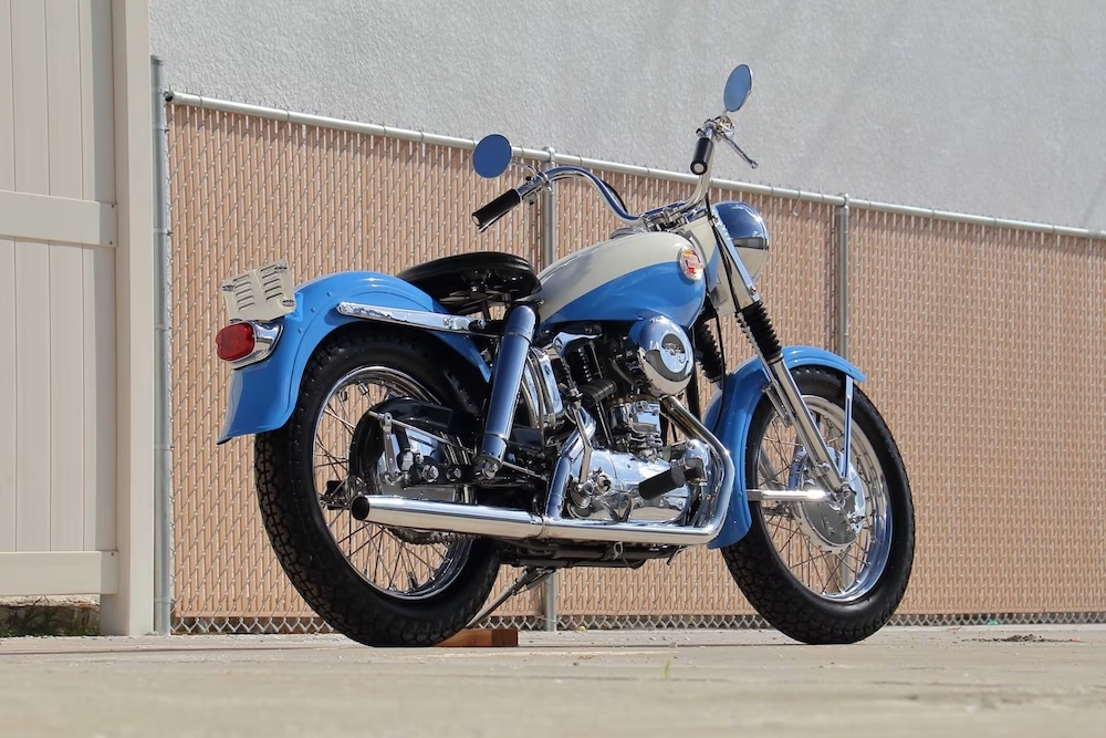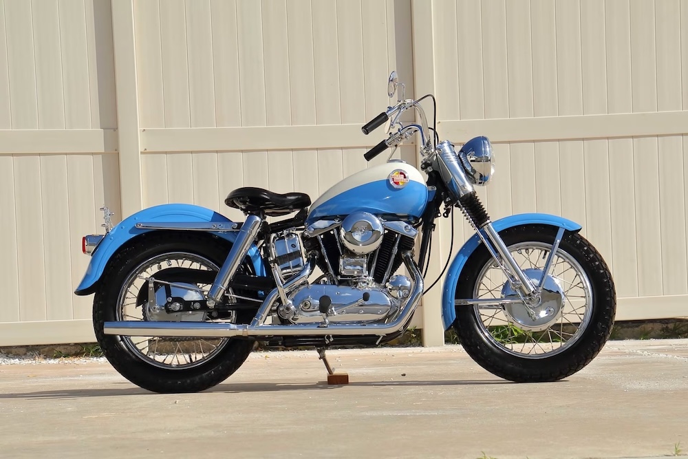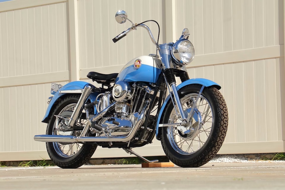 This particular example has undergone a comprehensive restoration completed by Route 65 Harley-Davidson in Indianola, Iowa. It was previously on display at Route 65 Harley-Davidson, a testament to its preservation and historical value. The bike proudly features its original Skyline Blue exterior with the distinctive Birch White tank panels, a combination that highlights the classic aesthetic of the late 1950s and enhances its timeless appeal.