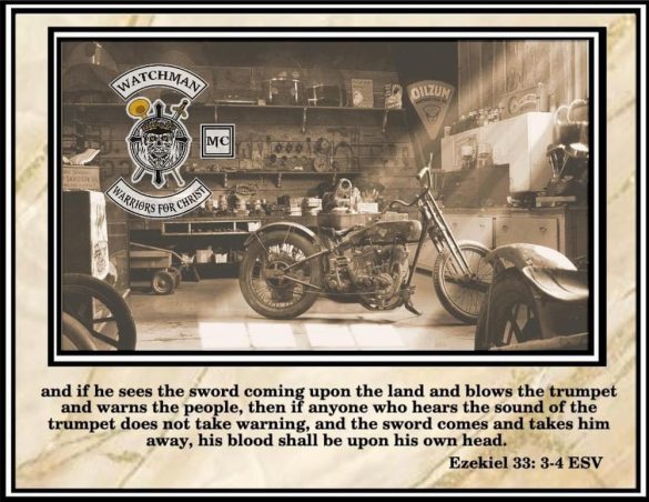 Watchman MC was founded with Biblical principles, at forefront included in its name Watchman from Ezekiel 33:7-9 that reads: “Son of man, I have made you a watchman for the people of Israel; so, hear the word I speak and give them warning from me. When I say to the wicked, ‘You wicked person, you will surely die,’ and you do not speak out to dissuade them from their ways, that wicked person will die for their sin, and I will hold you accountable for their blood. But if you do warn the wicked person to turn from their ways and they do not do so, they will die for their sin, though you yourself will be saved.”